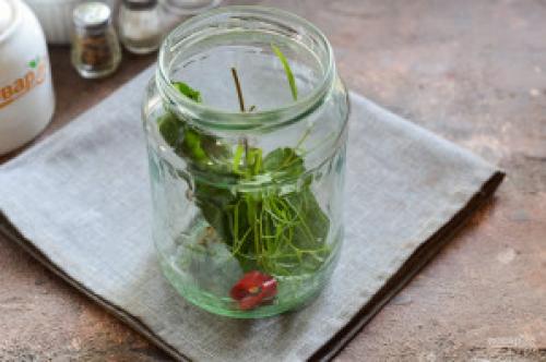 Банку герметично закатайте стерильной крышкой, поставьте дном вверх. Укройте заготовку теплым пледом или одеялом, оставьте на 24 часа в покое. Спустя указанное время перенесите заготовку в кладовку. На дно банки выложите чили, чеснок, зелень и специи.